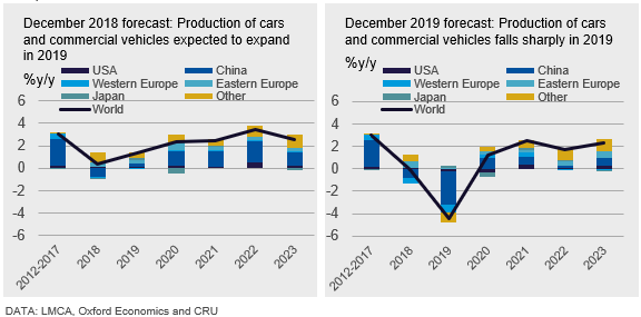 In December 2018, we were relatively optimistic about the prospects for the vehicle market in 2019. Global production of cars and commercial vehicles combined (i.e. autos) was expected to grow by just over 1 percent y/y. Our most recent estimate is much weaker and suggests a 4.5 percent contraction in output in 2019, primarily driven by weakness in China and Western Europe.