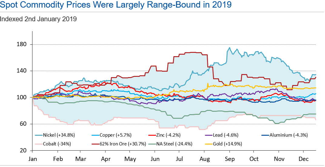 Metals prices were largely rangebound over 2019, the exceptions to this being iron ore and nickel, which rallied on the back of supply issues. For iron ore it was the Brumadinho dam disaster in January at Vale’s Córrego do Feijão iron ore mine that initially sent the price flying, and nickel has been held up by the Indonesian government’s ore export ban. The big fallers were cobalt, which fell precipitously as the higher prices that were fueled by investor overexuberance couldn’t hold as artisanal mining supplied the market; and steel…