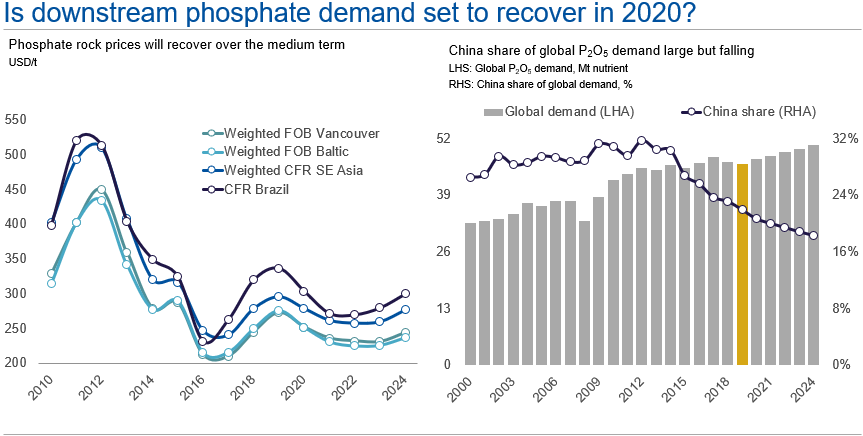 Phosphate rock demand was weak in 2019 due to unfavorable weather, oversupply and plentiful downstream phosphate inventories. Rock inventories are near a two-decade high and so prices will fall to $90/t FOB Morocco in 2020. Phosphate fertilizer production cuts and rising demand should start to erode global inventories, and so we expect prices to stabilize in 1Q20 and then rise to average $318/t DAP FOB China in 2020.