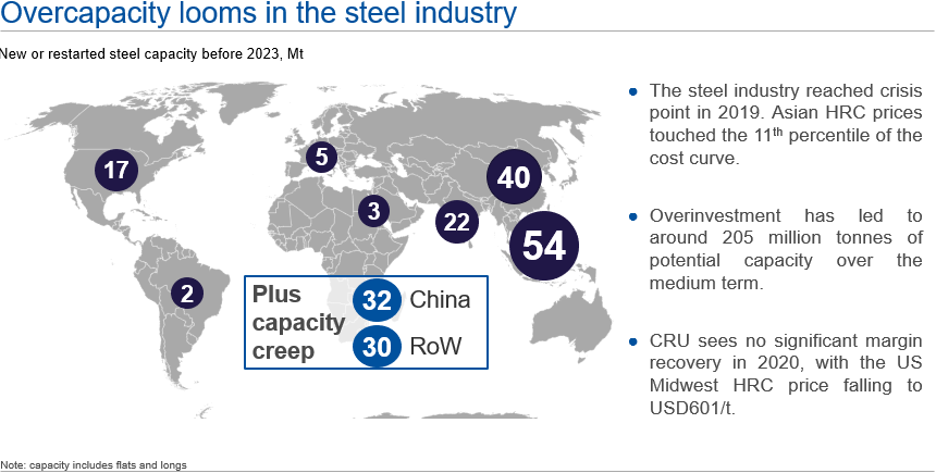 The steel industry reached crisis point in 2019, with Asian HRC prices at the 11th percentile of the steel cost curve. Although steel output fell, production cuts were too little, too late, and producers attempted to ride out the storm. High profits made in 2017-18 provided impetus for investment and there is around 205 million tonnes of potential capacity. Some of this new capacity will inevitably be delayed, but CRU sees no significant margin recovery in 2020, with U.S. Midwest HRC prices falling to USD601/t.