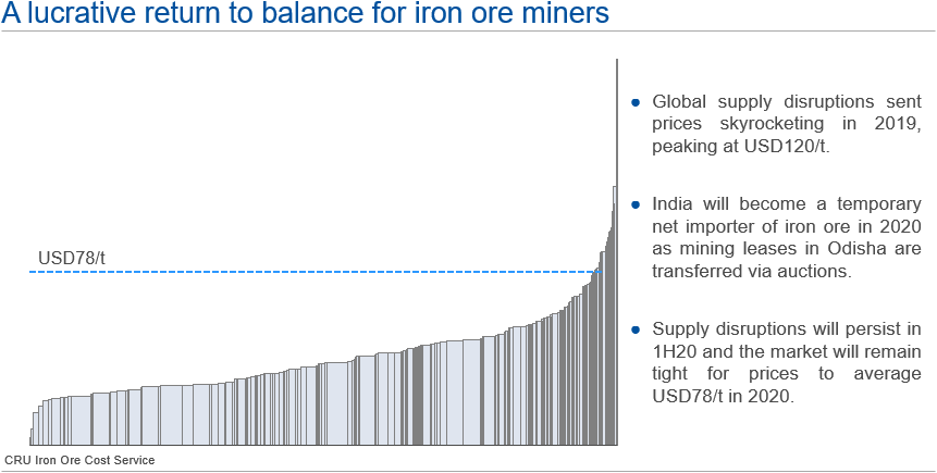 The tragic events of the Brumadinho dam disaster, along with a series of global supply disruptions from flooding, fires and cyclones, drove the iron ore price to a high of USD120/t in July 2019. Prices soon fell as a weak steel industry and macro concerns coincided with improved supply. CRU expects prices will continue to fall into 2020, but Rio Tinto’s and BHP’s operational issues will persist, and India will become a net importer of iron ore as mining leases are transferred via auctions. Although CRU sees improving supply and demand fundamentals in 2020, the market will remain relatively tight and the 62% CFR China prices will fall from a high base to average USD78/t in 2020.