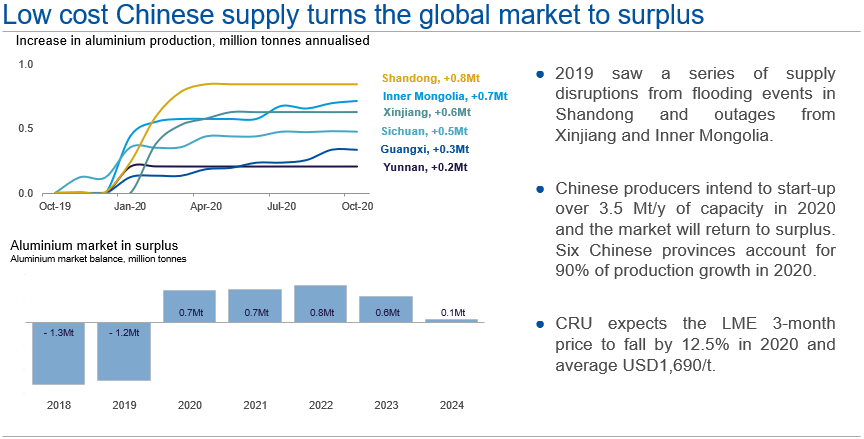 The Chinese aluminum industry experienced a series of disruptions from flooding events in Shandong and unexpected outages from Xinjiang and Inner Mongolia in 2019. As a result, Chinese producers intend to start up over 3.5 Mt/y of capacity in 2020, and China’s market balance will be shifted into surplus putting pressure on global prices. The combination of weak demand and resurgent Chinese supply growth will return the aluminum market to surplus in 2020. Prices will fall by 6.2 percent to average USD1,690/t in 2020.