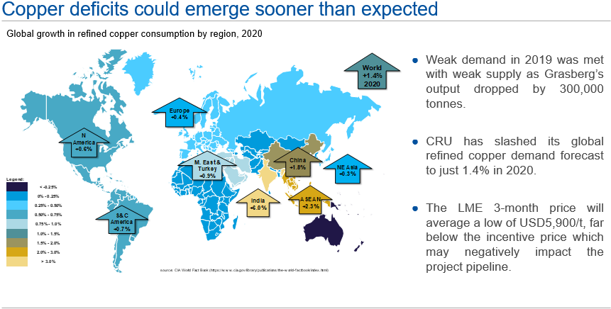 Weak demand in 2019 was met with weak supply, following a 300 kt loss in Grasberg’s production as it transitions underground. Mine supply will rebound in 2020, but disruptions will continue to be high. CRU slashed its global refined copper demand forecast for 2020; however, although we expect a mathematical surplus, the market will remain essentially balanced in 2020 and the LME 3-month copper price will hit a low of USD5,900/t. With the copper price below that needed to incentivize new investment, the project pipeline will remain weak over the medium term.