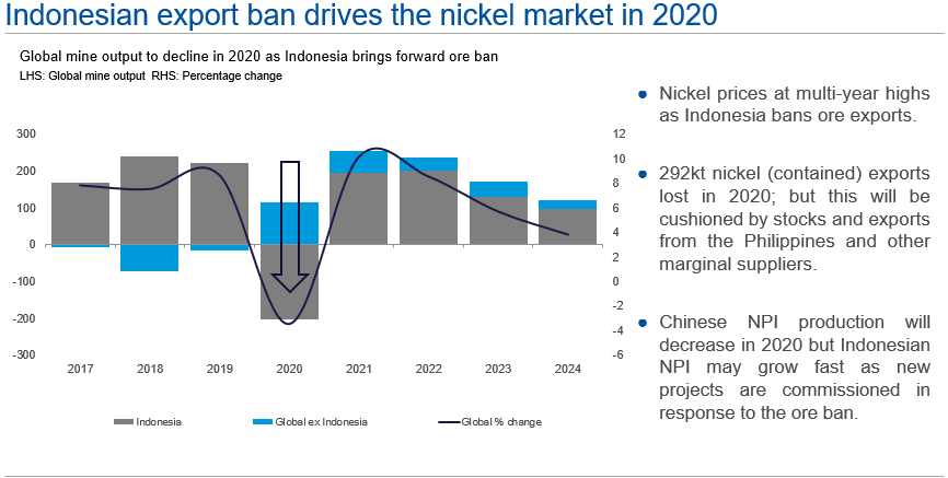 The early onset of the Indonesian ore exports ban led nickel prices to trade at multi-year highs on fears this will impact Chinese nickel pig iron (NPI) production and potentially result in a larger deficit in 2020. CRU believes the loss of around 292kt of contained nickel export volume will be cushioned by a stock drawdown and increased exports from the Philippines and other marginal suppliers. Indonesian NPI production may grow faster than expected in 2020 as new projects are commissioned in response to the ore ban. Lower stainless production will impact nickel demand in 2020, reflecting the bleak global macroeconomic outlook and an expectation of a marginal scrap usage increase. Prices will continue to rise to average USD15,520/t in 2020.
