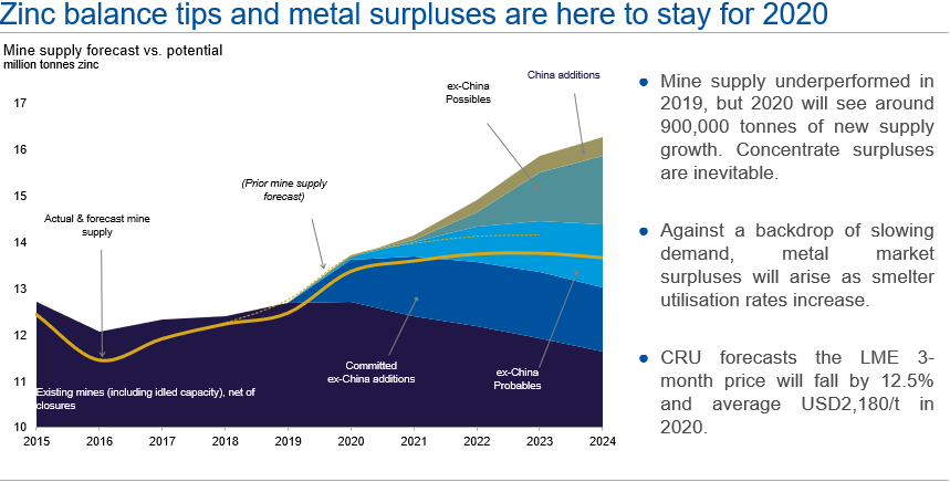 Mine supply underperformed expectations in 2019, with many large operations increasing production far slower than guidance. 2020 is set to see around 900,000 tonnes of mine supply growth and, although there is a risk of higher disruption, further concentrate surpluses are inevitable in 2020. Against a backdrop of slowing demand, metal market surpluses will arise as smelter utilization rates increase. CRU expects price-related cuts will accelerate from the early 2020s to bring the market back to balance. CRU forecasts the LME 3-month price will fall by 12.5 percent to average USD2,180/t in 2020.