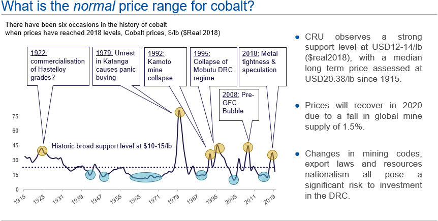 The most frequently asked question in 2019. CRU observes a strong support level at USD12-15/lb ($real2018), with a median long-term price assessed at USD20.38/lb since 1915. CRU expects prices will recover to average USD19/lb in 2020. This is due to a fall in global mine supply of 1.5 percent. Mutanda, the largest cobalt mine in the world, will close in 2020. However, this comes as several other mining operations ramp-up capacity. Changes to mining codes, export laws and even resource nationalism all pose a significant risk to investment appetite in the DRC.
