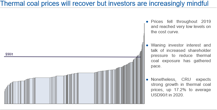 Prices fell throughout 2019 and reached very low levels on the cost curve. Waning investor interest and the talk of increased shareholder pressure on mining majors to reduce their coal exposure has gathered pace. Nonetheless, CRU expects strong growth in thermal coal prices, up 17.2 percent in 2020 to average USD90/t FOB Newcastle 6,000.