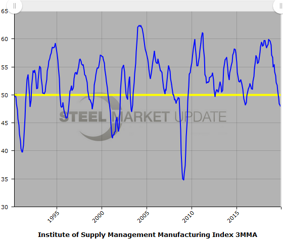 Below is a graph showing the history of the ISM Manufacturing Index on a three-month moving average. You will need to view the graph on our website to use its interactive features; you can do so by clicking here. If you need assistance logging in to or navigating the website, please contact us at info@SteelMarketUpdate.com.