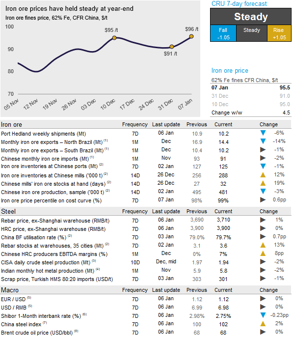 Iron ore prices rose sharply in the past week as Chinese restocking has continued and concerns about a cyclone forming northeast of Pilbara have increased. On Tuesday, Jan. 7, CRU has assessed the 62% Fe fines price at $95.5 /t, up $4.5 /t w/w.