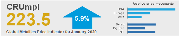 The CRU metallics price indicator (CRUmpi) rose by 5.9 percent m/m to 223.5 (see chart) following price increases in nearly every market, the highest level since August 2019. Solid scrap demand has offset better than seasonally typical supply due to mild winter weather in the Northern Hemisphere. Pig iron demand from China is still robust, which supported prices despite an increase in availability from Ukraine.