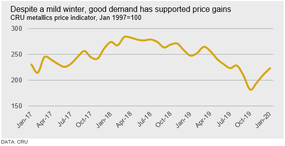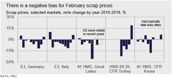 Last year was the first time that scrap prices rose in February since 2010, an anomaly that followed an atypical fall in scrap prices in January 2019. Prices have followed the more typical seasonal trend of rising in January this year, though conditions are slightly uncharacteristic of the period. Winter weather is very mild, enabling greater supply while good demand has still supported price gains. Ongoing mild weather and improved inflows following recent scrap price gains could lead to an oversupplied market and turn prices lower in February. Equally, though, with steel prices expected to rise further in February, steelmakers may be less willing to undermine scrap prices.