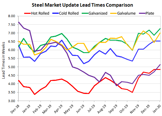 Reporting average lead times since mid-December before the holiday break, hot rolled and cold rolled lead times are virtually unchanged at 4.85 weeks and 6.52 weeks, respectively. Galvanized lead times extended to 7.26 weeks from 6.86 weeks. Galvalume lead times now average 7.00 weeks, up from 6.43, while plate lead times are now at 5.13 weeks, up from 4.71.