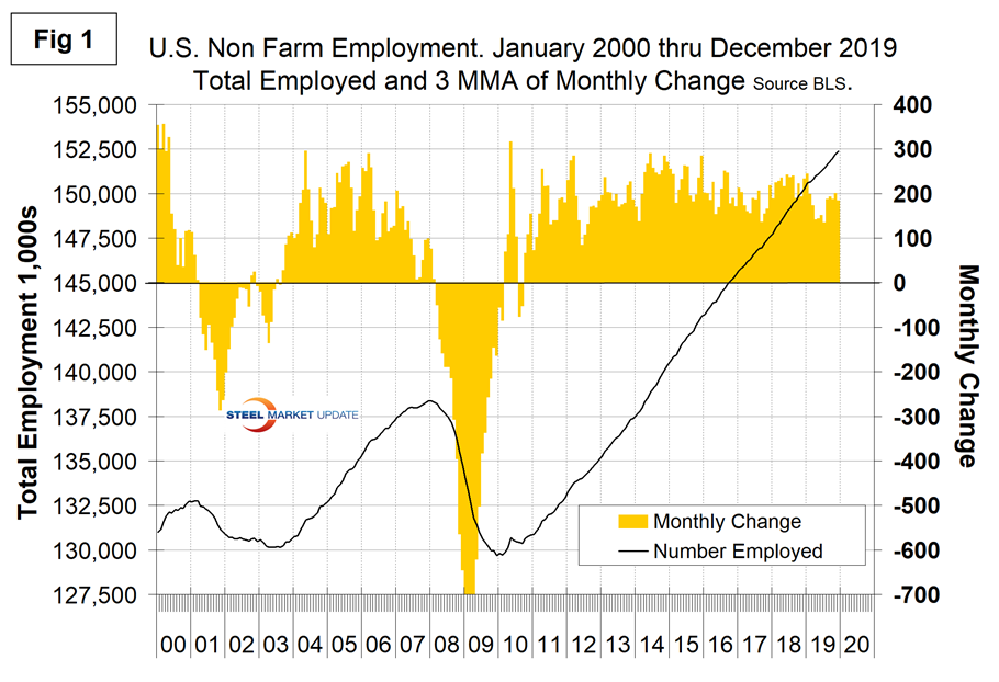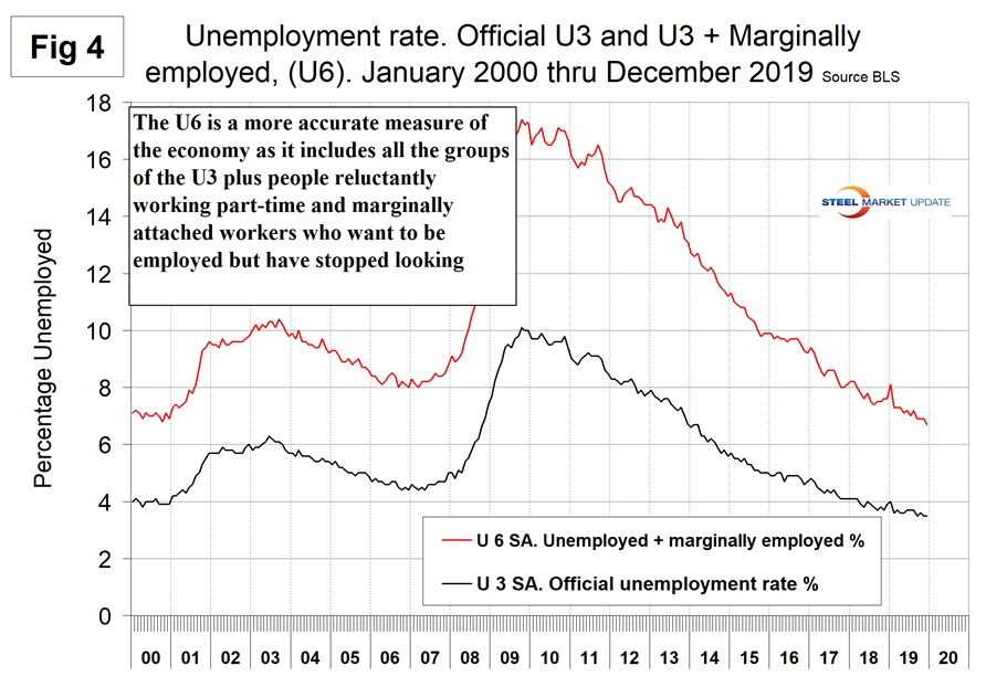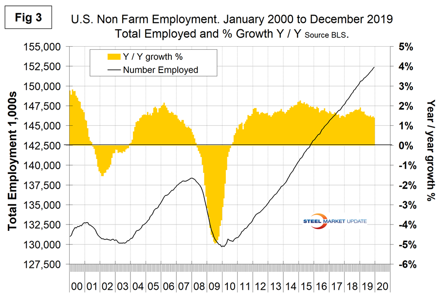 Figure 1 shows the three-month moving average (3MMA) of the number of jobs created monthly since 2000 as the brown bars and the total number employed as the black line. Economy.com summarized as follows: “Payrolls increased by 145,000 jobs in December, below our expectation and consensus, while the unemployment rate was unchanged at 3.5%. Revisions to previous months were small. The labor market remains solid, though it shifted down in 2019. Retail was strong, in part due the seasonal effect of the late Thanksgiving, as well as healthcare and leisure/hospitality. Detracting from the top line were manufacturing, transportation and warehousing, which reflected the challenging conditions in the factory sector.”