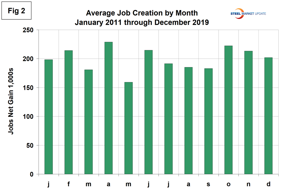 The employment data has been seasonally adjusted. We have developed Figure 2 to examine if any seasonality is left in the data after adjustment. We think it’s significant to look at the results this way because there is so much variability in the numbers that a long-term context is necessary. It doesn’t look as though the BLS seasonal adjustment is very effective. In the nine years since and including 2011, the average month-on-month change from November to December has been negative 5.3 percent. This year the change was negative 43.4 percent, partly because November was swelled by GM workers coming back off strike.