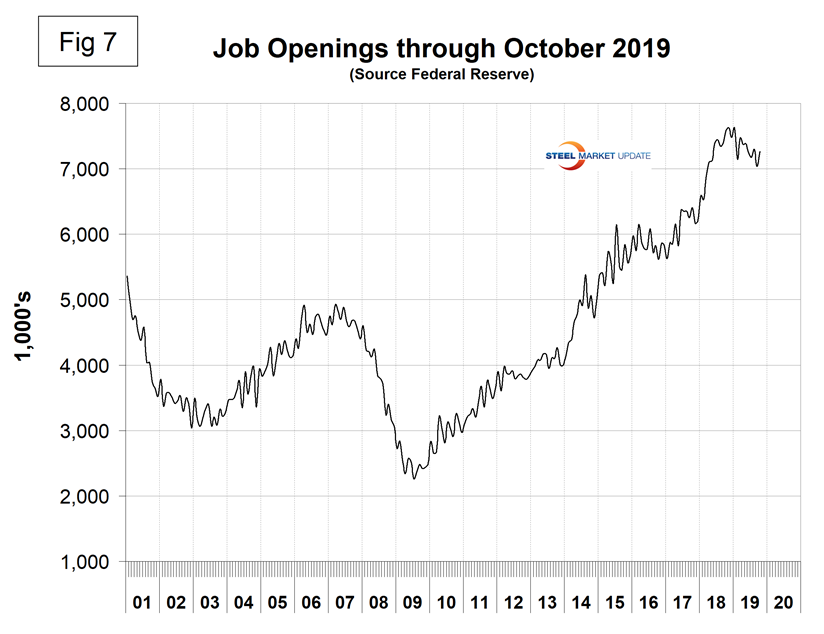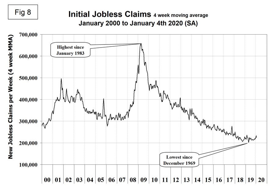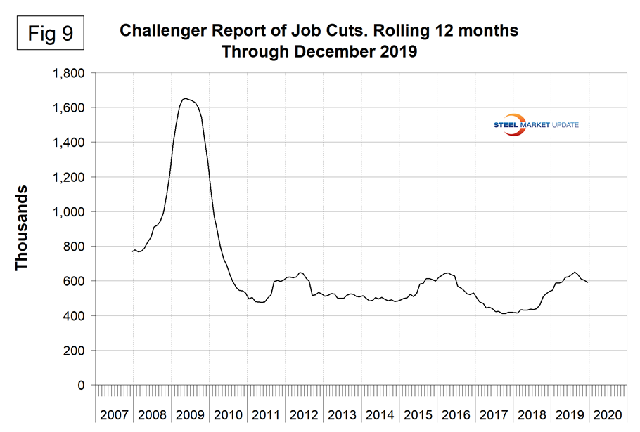 Challenger Grey and Christmas Inc. produce a monthly report of job cuts in the U.S. Job cuts were 32,800 in December; the average for the year was 49,400. Economy.com reported: “Job cut announcements fell to 32,843 in December, dropping 26% from November and 25% from a year earlier. Total job cuts for 2019 reached 592,556, the highest annual total since 2015. December layoff announcements were concentrated in the automotive and transportation industries. Retail announced the most job cuts of any industry for the third consecutive year. Mining industries experienced the largest percent increase in layoff announcements from 2018 to 2019.”