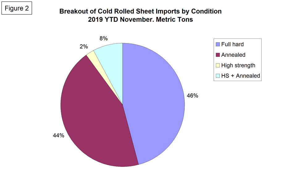Through November 2019, of the total cold rolled sheet and strip imports into the U.S., only 2.4 percent was strip. By gauge range the sheet broke down to: 28.0 percent < 0.5mm, 30.3 percent ≥ 0.5 to 1.0 mm, 40.9 percent> 1 to 3mm thick and 0.7 percent > 3 mm.
