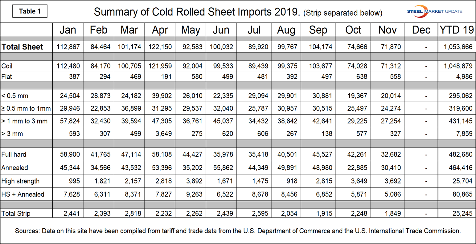 Table 1 is a summary for 2019 through November of cold rolled imports showing gauge ranges and condition and the annual year-to-date total for sheet. Strip is itemized separately at the bottom of the table. Both are in metric tons.
