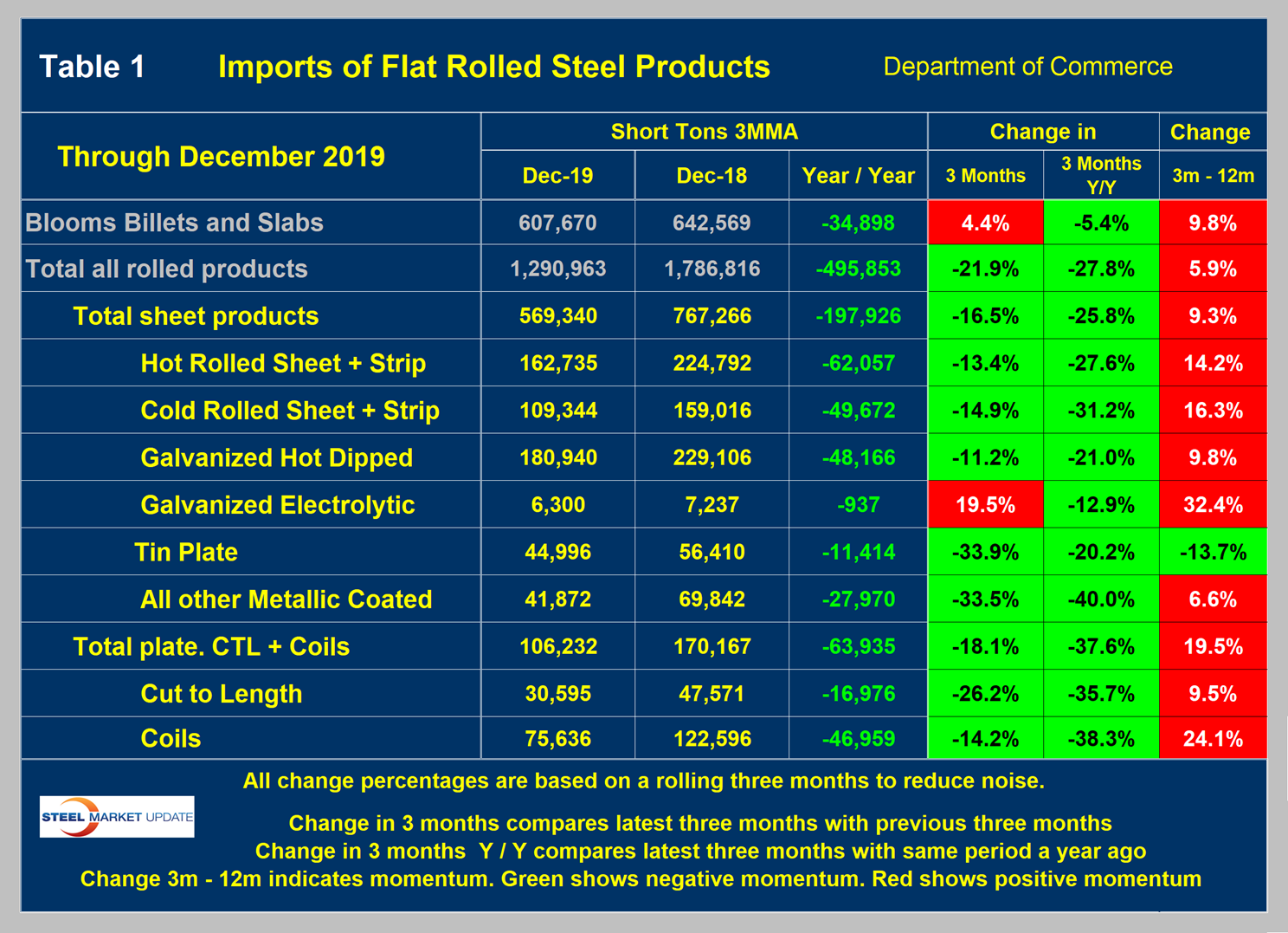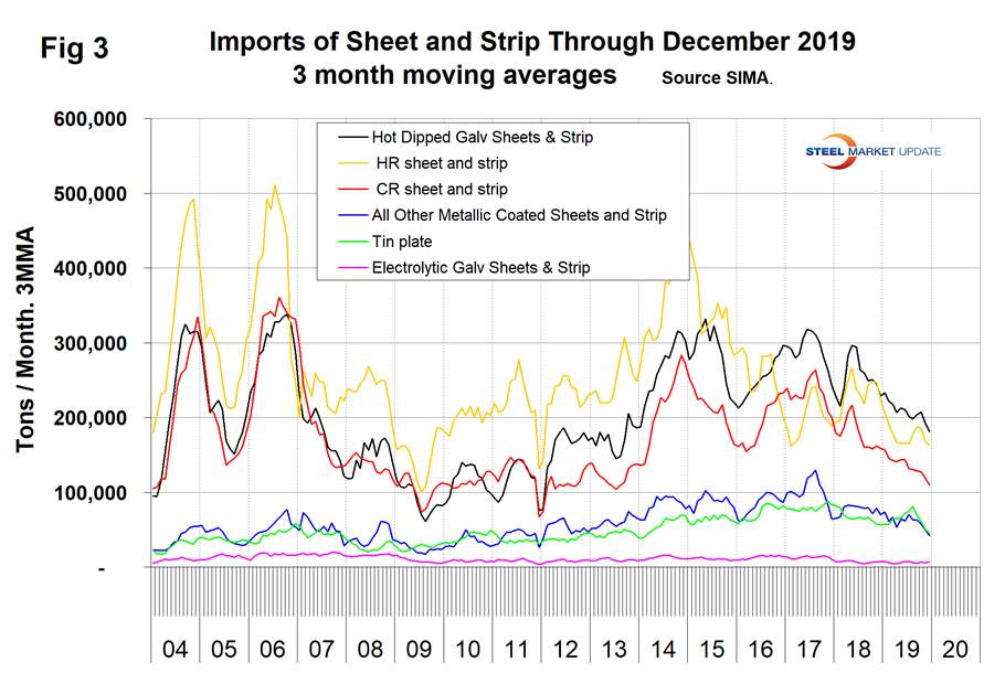 Figure 1 shows the tonnage of total rolled steel and semifinished imports through December on a 3MMA basis. Total rolled product volume has been on an erratically downward trend since mid-2017. Imports of semifinished have been very erratic since July 2018, ranging from a high of 1.28 million tons in April 2019 to a low of 0.21 million tons in August 2019. December’s volume was 917,998 tons, therefore in the top half of the range. This is why we use a 3MMA calculation in our analyses, the result of which is the much smoother line for semis in Figure 1. The Section 232 legislation has had no effect on semifinished product imports.