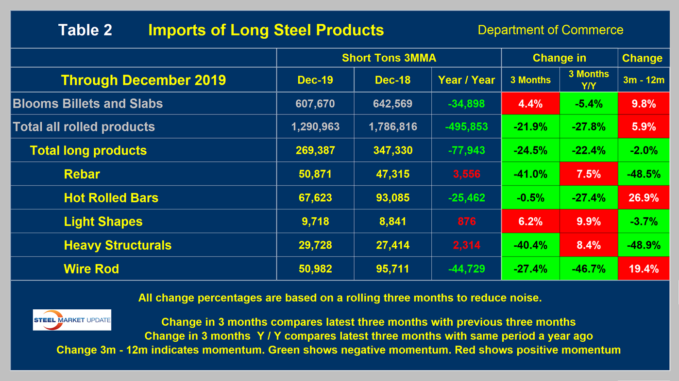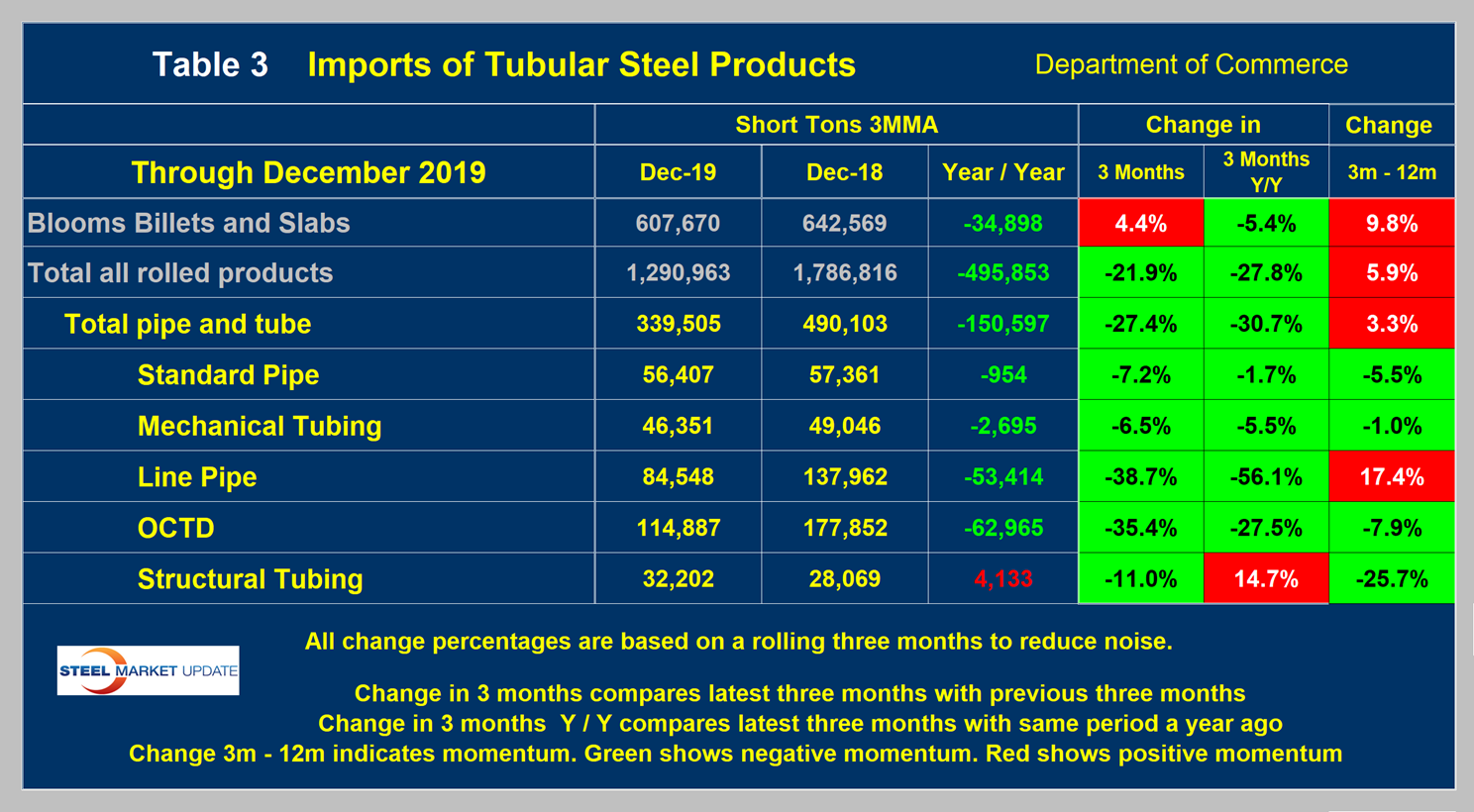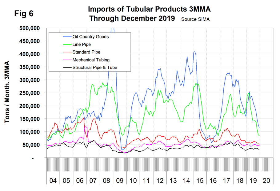 Imports of total rolled products in December were the lowest since December 2009 on a single-month basis and the lowest since February 2010 on a 3MMA basis. In the 12 months August 2018 through August 2019, total rolled product imports on a 3MMA basis were consistently in the range of 1.70 to 1.94 million tons. The September, October, November and December total rolled product volumes broke out of that range to the downside at 1.65, 1.54, 1.38 and 1.30 million tons, respectively. Year over year on a 3MMA basis, sheet products were down by 25.8 percent, plate products were down by 37.6 percent, long products were down by 22.4 percent and tubulars were down by 30.7 percent. Imports of flat rolled, tubulars and longs all had a recent peak in May 2018. Since then total flat rolled (sheet + plate) imports have consistently declined, which may be tariff driven. This is not so obvious for longs and tubulars where the decline since May 2018 has been less consistent.