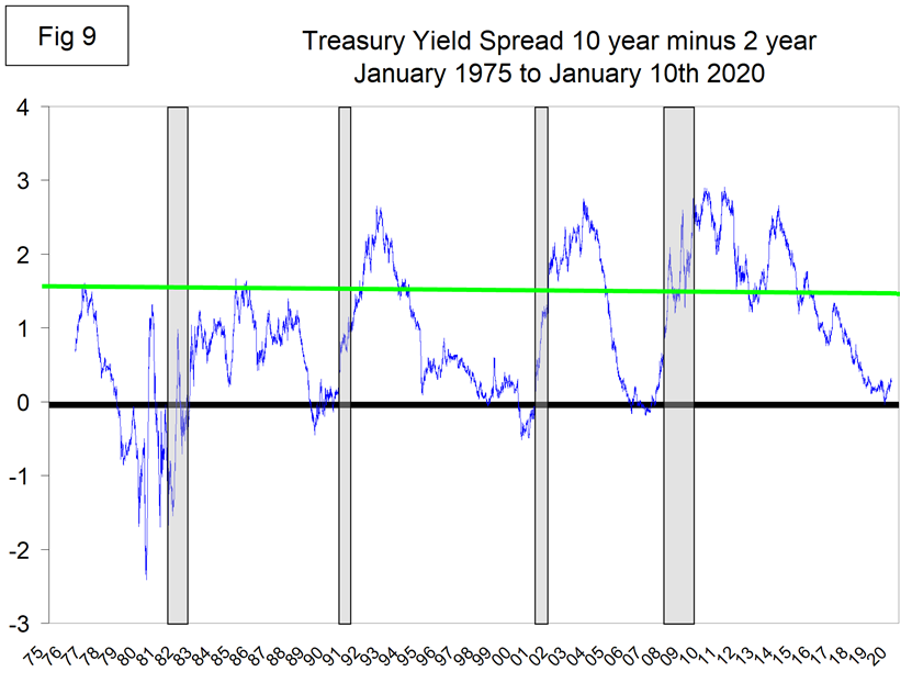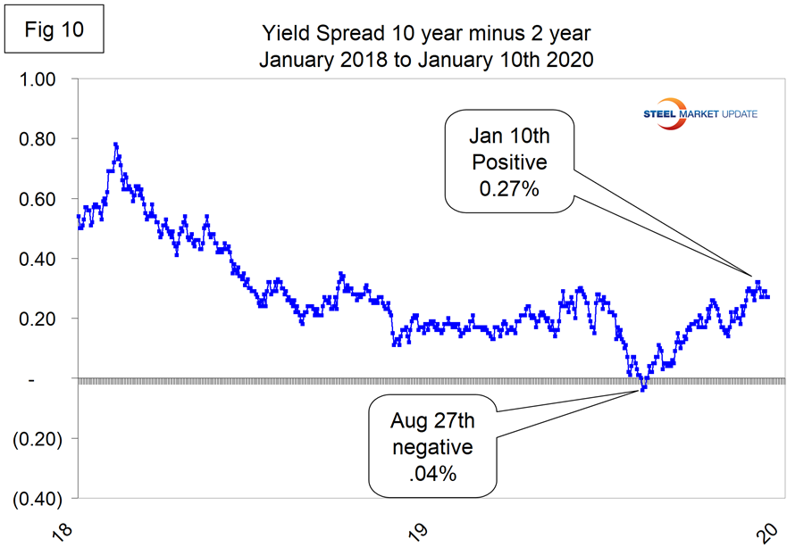 The Treasury spread is developed by subtracting a shorter-term from a longer-term Treasury yield. Ten-year interest rates minus two-year interest rates, for example, as shown in Figure 9. There was a lot written about negative yield spreads in 2019. Some analysts use different time frames, for example, 10 year minus 3 months. For our purpose here we are sticking with the 10-2, which seems to be the most widely recognized by analysts. A spread that is increasing is a sign of higher growth and inflation as bank lending becomes more profitable (borrow short and lend long) and loan growth is expected to accelerate. A declining or contracting yield spread foreshadows lower growth and inflation due to contractions in bank loan growth due to reduced profitability. The 10-2 spread went slightly negative for three days at the end of August before recovering to positive 0.27 on Jan. 10. We have blown up Figure 10 to show the last 25 months in detail. At present we are dodging this bullet as the decline in the spread has reversed since Aug. 27.
