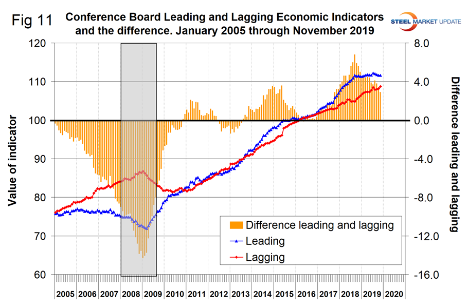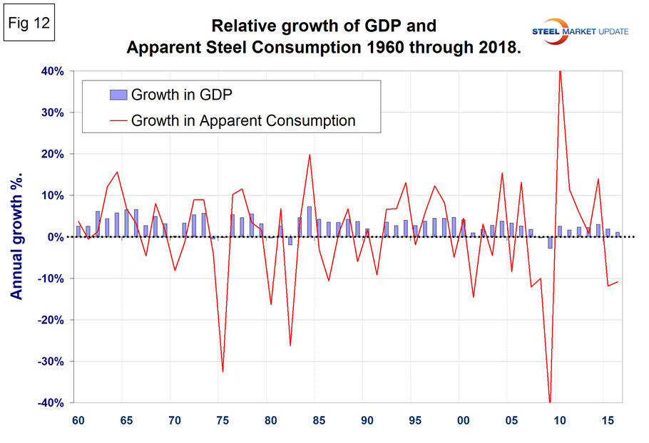Note: Steel demand is related to GDP but is vastly more volatile both on the downside during recessions and on the upside at times of economic growth. Figure 12 compares the change in GDP and in apparent steel consumption over a period of 58 years. Steel consumption routinely varies by plus or minus 10 percent or more and this will happen again. This means that corporate managers whose business is related to steel must be ready with preemptive financial measures when the thunder clouds form. This Steel Market Update analysis attempts to provide guidance on the likelihood of a recession in the next six months.