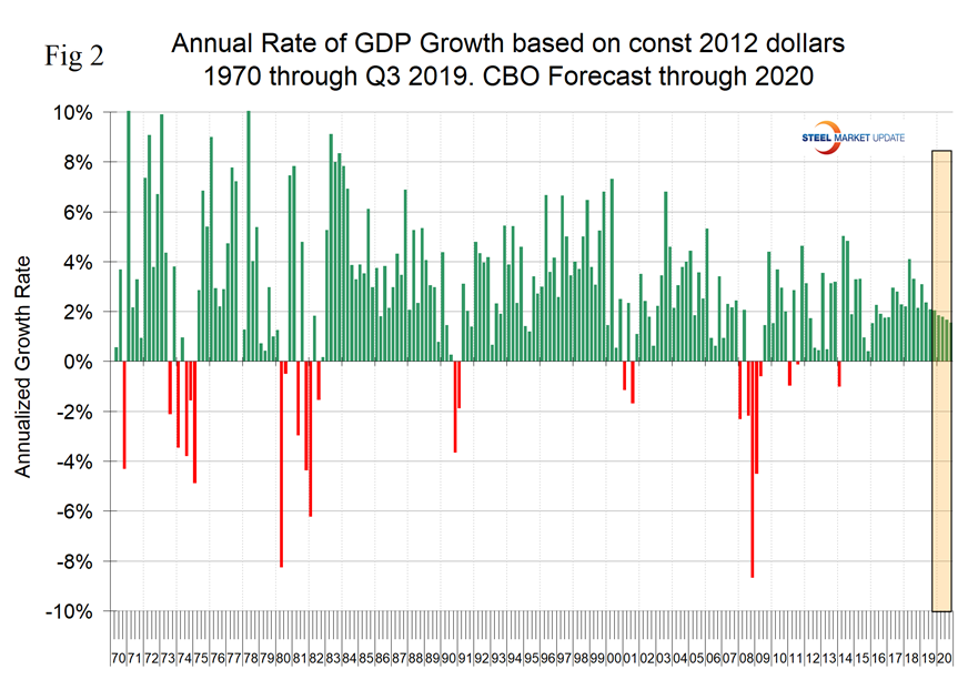 Figure 2 provides a history of U.S. recessions since 1970. Recessions occurred in 1974, 1980, 1981, 1990, 2001 and 2008. In its third estimate of the growth of U.S. GDP for Q3 2019, the BEA reported the growth of GDP to be 2.1 percent. This is a quarter-on-quarter result. On a trailing 12-month basis GDP grew 2.44 percent in the third quarter. Congressional Budget Office economists expect economic growth to decline in upcoming quarters but not to become negative through 2020.