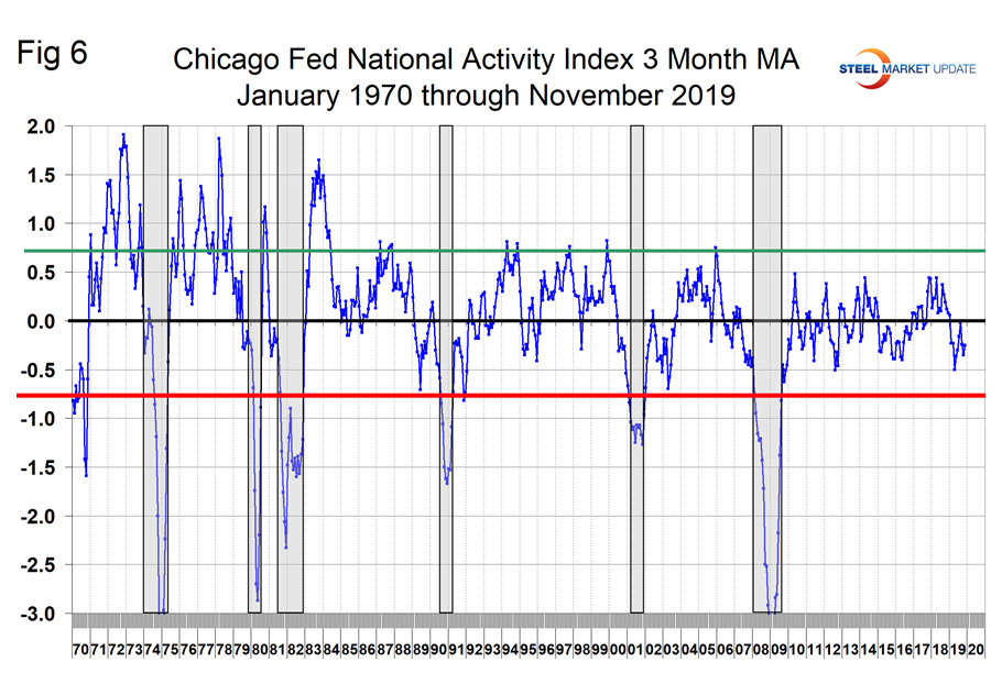 Since our data stream began in January 1970, the CFNAI has predicted every recession, but in between there have been stumbles and false alarms (Figure 6). The CFNAI has been in negative territory since January 2019 but improved every month in the four months May through August, then declined in September and October before recovering slightly in November to negative 0.25. This is not in the danger zone of negativity >-0.7