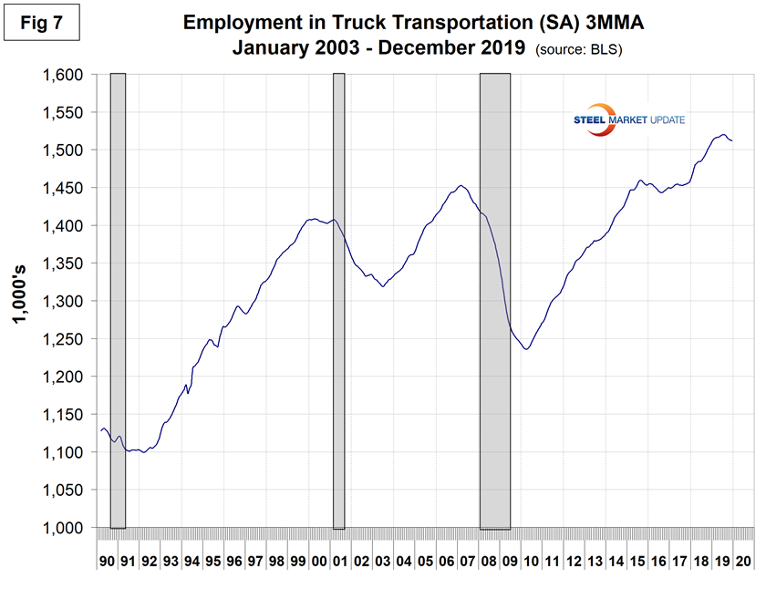 Employment in Trucking: Figure 7 shows total truck driver employment as reported monthly by the BEA. As a measure of economic activity this indicator has predicted the last three recessions. Trucking employment is the indicator of greatest concern in this analysis and declined in five out of six months through December.