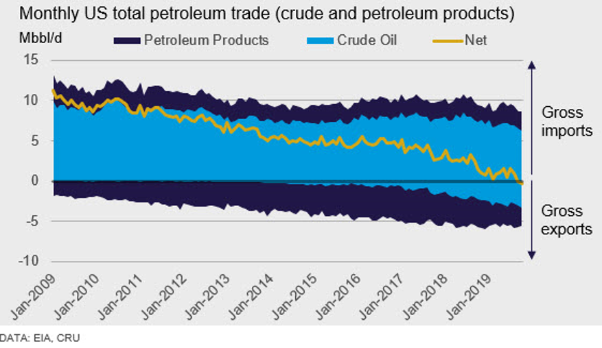 September 2019 was a momentous month in the U.S. oil market. It marked the point in time that the U.S. became a net exporter of crude oil and petroleum products. Ten years ago, the U.S. was a net importer of more than 10Mbbl/d of crude oil and petroleum products combined. This resulted in significant investment over the past decade in refineries to process heavy sour crudes from the likes of Canada, Mexico and Saudi Arabia. Since the explosion of the shale oil industry, the U.S. has become the world’s largest producer and has moved itself into a position of net exports. The U.S. still imports a lot of crude oil – 6.2Mbbl/d in September 2019 to be exact. This is because of that significant investment in refinery upgrades. The U.S. exports the majority of the sweet crudes produced from shale at a premium compared to the tar-like crudes it imports from Canada.
