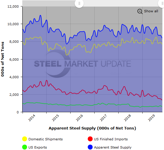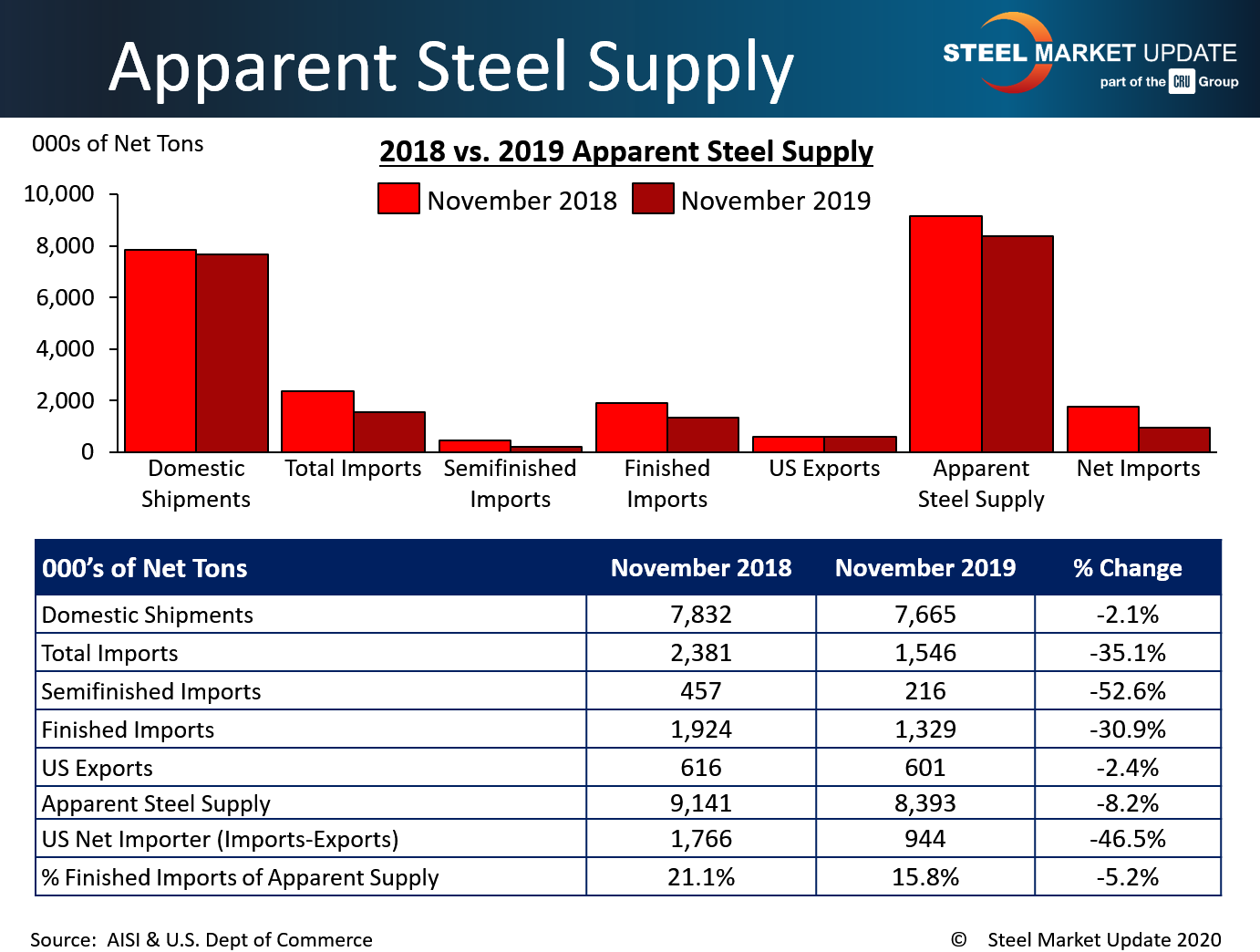 Apparent U.S. steel supply slipped to 8.4 million net tons in November, according to data from the American Iron and Steel Institute and U.S. Department of Commerce. November supply is now at a three-year low, the lowest seen since November 2016 when supply was 8.1 million tons. Apparent steel supply, a proxy for demand, is determined by adding domestic steel shipments and finished U.S. steel imports, then subtracting total U.S. steel exports.