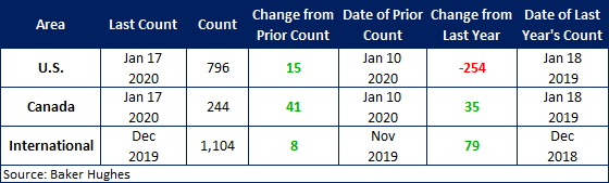 Rebounding from its seasonal New Year’s dip, the Canadian rig count increased by 41 last week to 244 rigs, with oil rigs up 32 and gas rigs up 9. Compared to last year, the 244 count is up 35 rigs, with oil rigs up 24 and gas rigs up 11. See the second graph below for a history of active Canadian rig counts.