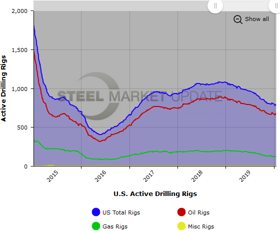 The number of active U.S. rigs rose by 15 to 796, with oil rigs up 14, gas rigs up 1, and miscellaneous rigs unchanged. Compared to this time last year, the 796 count is down 254 rigs, with oil rigs down 179, gas rigs down 78, and miscellaneous rigs up 3. See the first graph below for a history of active U.S. rig counts.