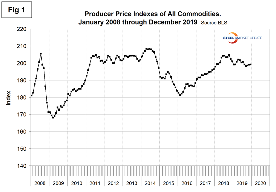 Figure 1 shows the composite PPI of all commodities since January 2008. The index rose steadily for 2½ years through October 2018 before declining by 2.6 percent through December 2019. Overall, the composite was up by 2.9 percent in the 12 months of 2018 and down by 0.9 percent 1n 2019.