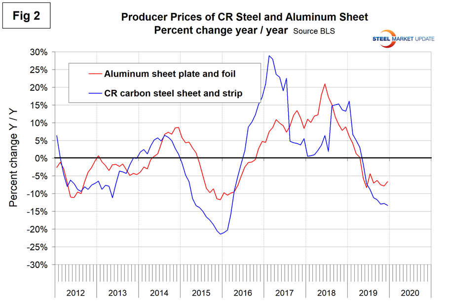 Figure 2 shows the year-over-year comparison of the price change of cold rolled steel sheet and flat rolled aluminum. The lines crossed in August 2018 when the steel price began to escalate faster than aluminum. This relationship reversed in July 2019 when the price of cold rolled declined faster than that of aluminum sheet.