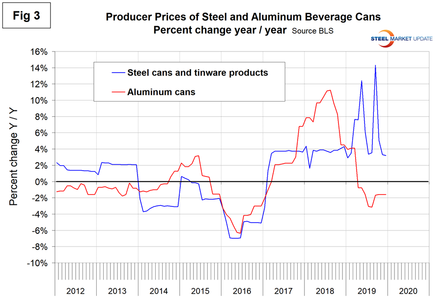 Figure 3 shows the same comparison for steel tinware products and aluminum cans, a very different scenario from their respective raw materials. The price of steel cans rose by 3.2 percent is 2019 as aluminum can prices dropped by 1.7 percent.