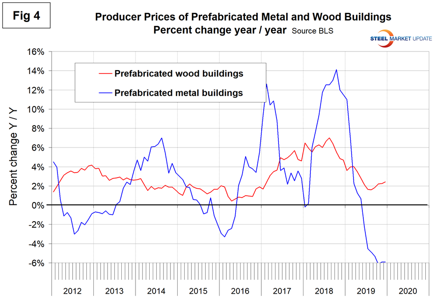 Figure 4 compares prefabricated metal with prefabricated wood buildings. In this analysis steel improved its competitive advantage in 2019. In 12 months through December, the PPI of wood buildings increased by 1.9 percent as steel buildings declined by 5.9 percent.