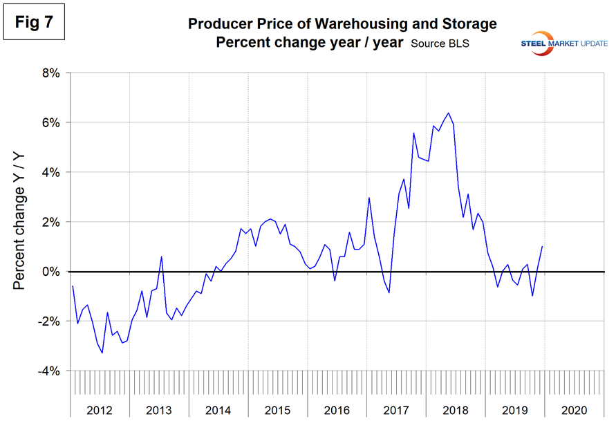 Figure 7 shows that the rate of change of the price of warehousing and storage declined steadily from April 2018 through March 2019 and since then has been relatively stable.