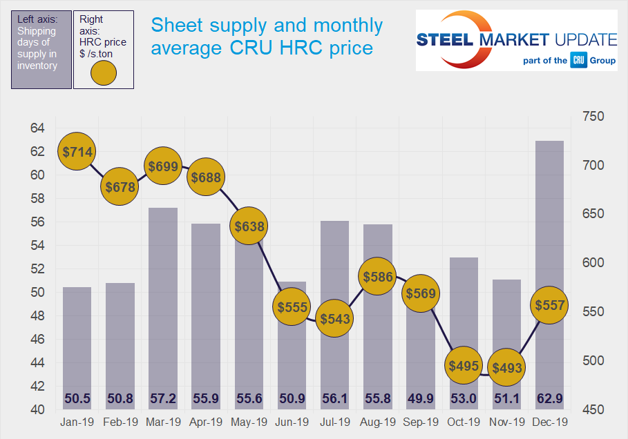 Going forward, we expect shipments to pick up in January and service centers to work through some of their heightened inventories. January inventories may remain elevated, though, as we continue to see cautious optimism regarding sheet pricing and steady buying on mill contracts priced below spot levels.