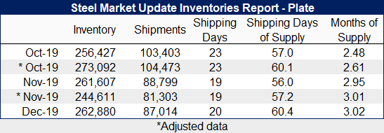 Plate volumes remained flat month over month, though shipments declined 2 percent. As a result, service center plate inventories increased to 60.4 shipping days of supply, up from 56 in November. This represented 3.02 months of supply, up from 2.95 in November.