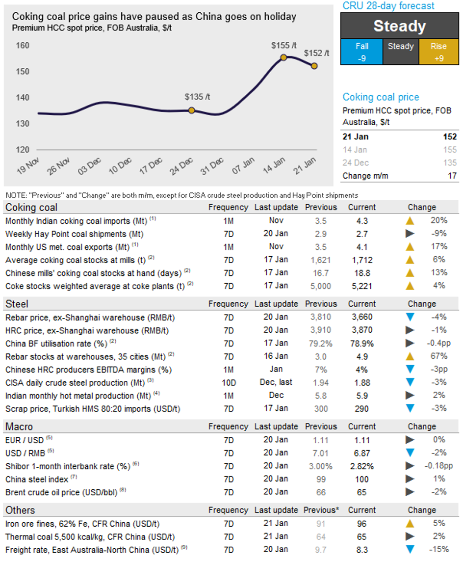 On Jan. 21, CRU assessed the Premium HCC, $2 /t lower w/w at $153 /t, FOB Australia. We expect prices to stay around current levels in the next couple of weeks as upside pressures caused by supply concerns will be offset to some extent by weak Chinese buying due to the Lunar New Year.
