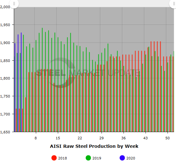 The last time weekly production was this high was the week ending May 11, 2019, when 1,927,000 tons of steel were produced at a capability utilization rate of 82.8 percent.