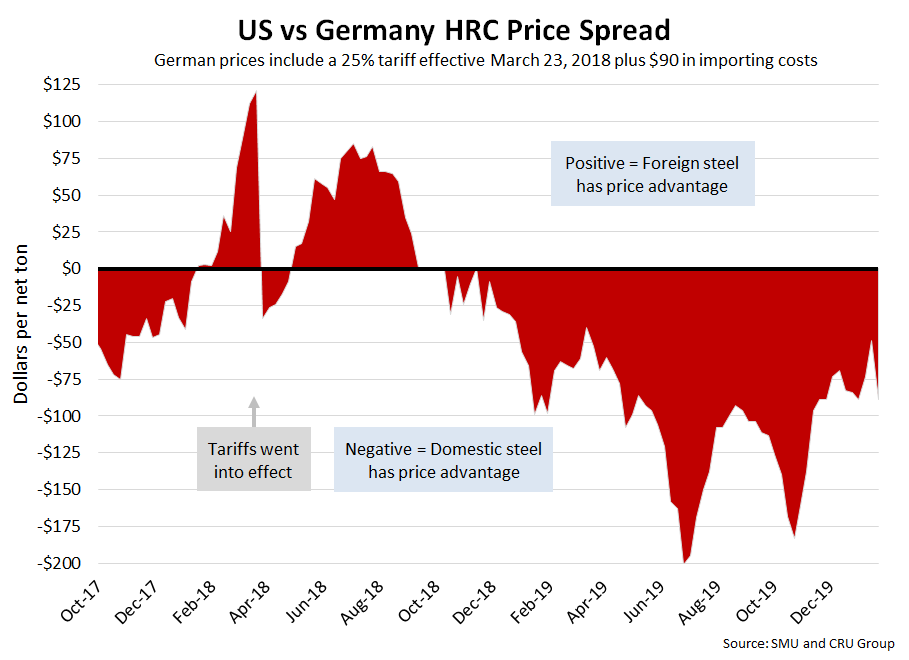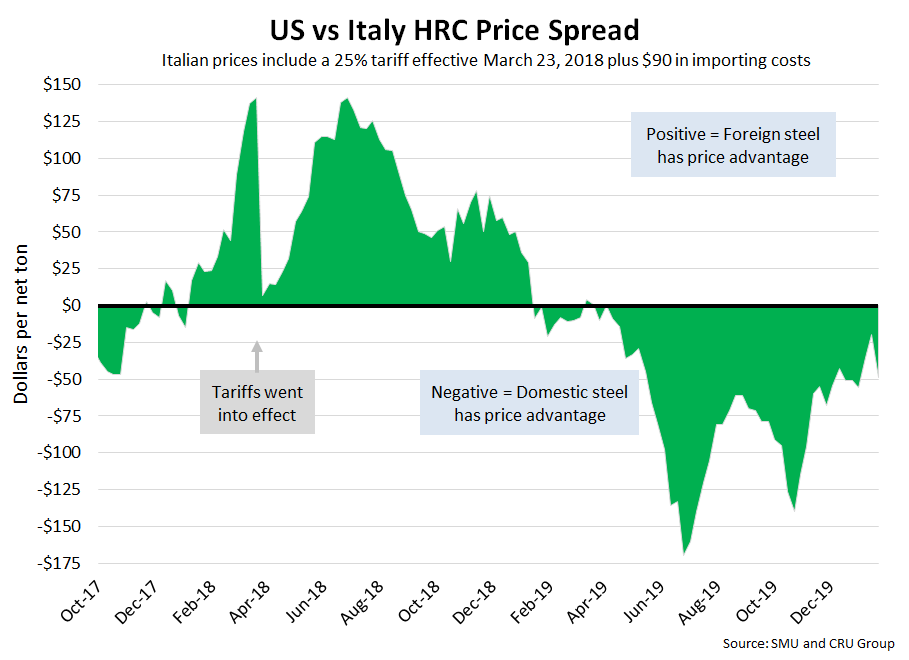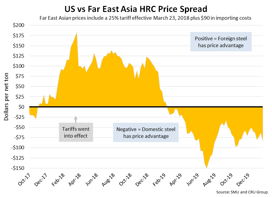 SMU includes a 25 percent import tariff effective on foreign prices after March 23, 2018. We then add $90 per ton to the foreign prices in consideration of freight costs, handling, trader margin, etc., to provide an approximate “CIF U.S. ports price” that can be compared against the SMU U.S. hot rolled price. Note that we do not include any antidumping (AD) or countervailing duties (CVD) in this analysis.