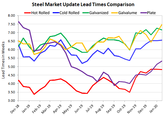 Comparing the data, the average lead time for spot orders of hot rolled last week was 4.83 weeks, versus 4.84 in mid-December. Cold rolled last week was at 6.56 weeks, up from 6.52 the month prior. Galvanized was at 7.15, up from 6.86, while Galvalume was at 7.46 weeks. The average plate lead time last week was 5.33 weeks, slightly longer than the 5.13 in SMU’s survey last month.
