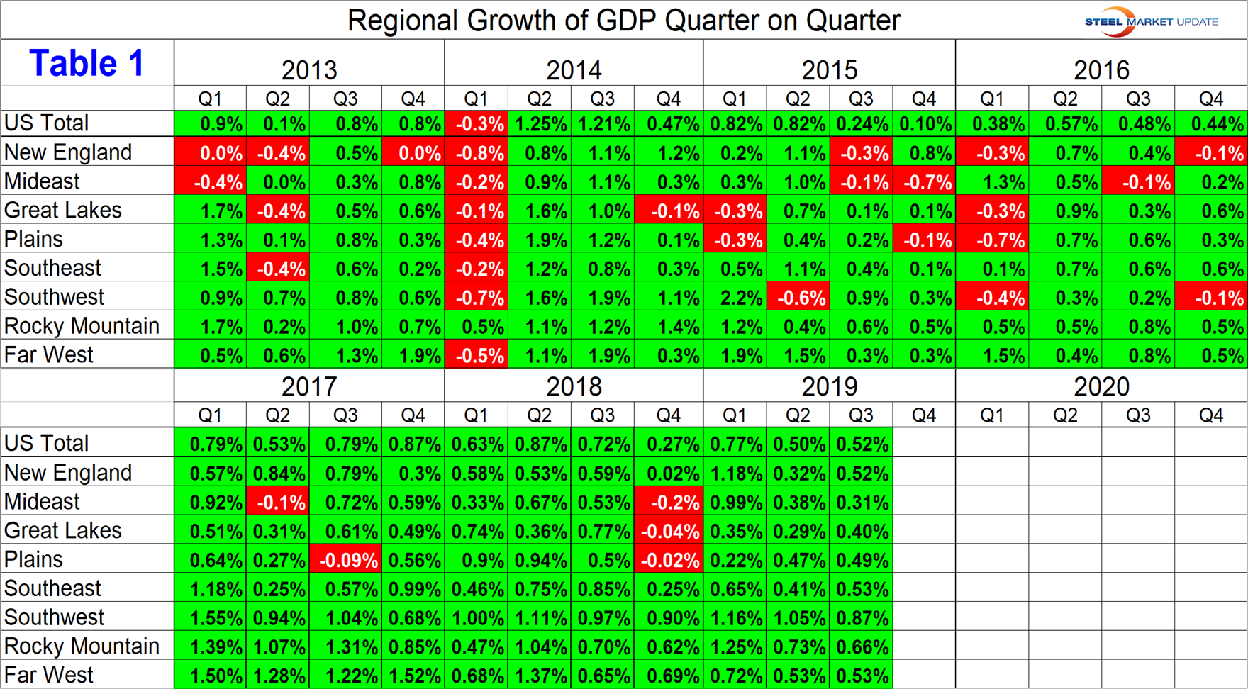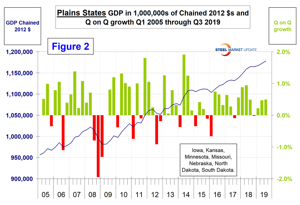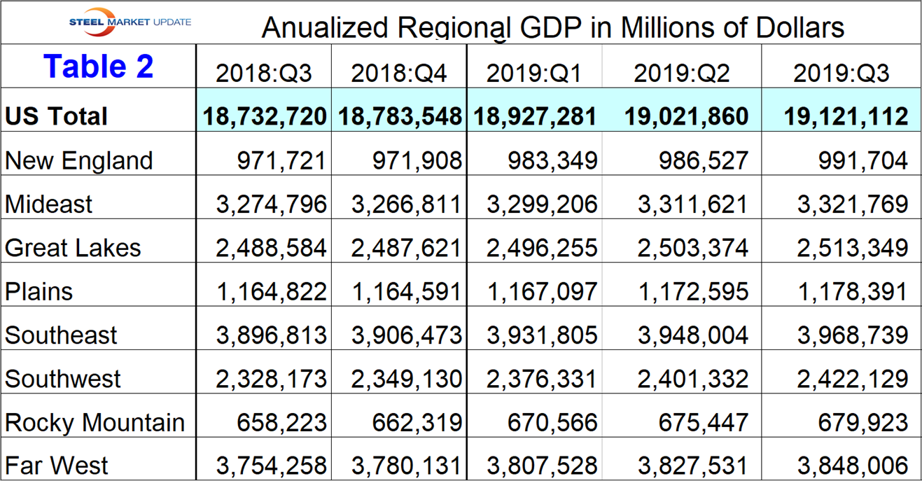 The BEA reports GDP by state and region on a quarterly basis. This data is released several weeks after the national report. The latest data was updated through Q3 2019. Even though this might be considered historically “old,” we think it’s worth reporting because it’s the foundation for where we are now. The data is reported in chained 2012 dollars seasonally adjusted. Steel Market Update analyzes the data and reports to subscribers quarterly by region. Table 1 shows the growth of regional GDP quarter on quarter. (These growth numbers are not annualized, as opposed to the headline number for the growth of national GDP. Annualized means multiplied by four.) Every region had positive growth in each of the first three quarters of 2019 with the South West having the highest growth year to date at 3.1 percent followed by the Rocky Mountains at 2.7 percent.