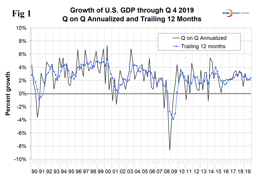 The first estimate of U.S. GDP growth in Q4 2019 was 2.1 percent, unchanged from Q3. On a trailing 12-month basis, GDP grew at 2.32 percent in the fourth quarter.