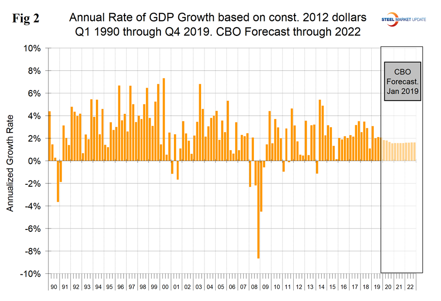 Figure 2 shows the headline quarterly results since 1990 and the January 2019 Congressional Budget Office forecast through 2022. The CBO underestimated the growth rate in the first quarter of 2019, but was close for the second, third and fourth quarters.