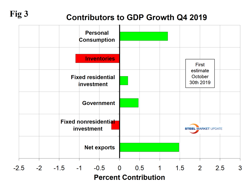 The mix of the six major contributory components in the final GDP growth calculation is shown in Figure 3. Normally, personal consumption is the dominant growth driver, but this was not the case in the latest data when this contribution was 1.20 percent, down from 3.03 percent in Q2 2019. Personal consumption includes goods and services, the goods portion of which includes both durables and non-durables. Fixed nonresidential investment and inventory changes detracted from the overall result. The effect of inventories is always a wild card in the GDP calculation. Declining inventories are entered as a negative in the GDP calculation. Note that in the definitions at the end of this piece, inventories are not mentioned. Over the long run, inventory changes are a wash and simply move the reported growth from one period to another.