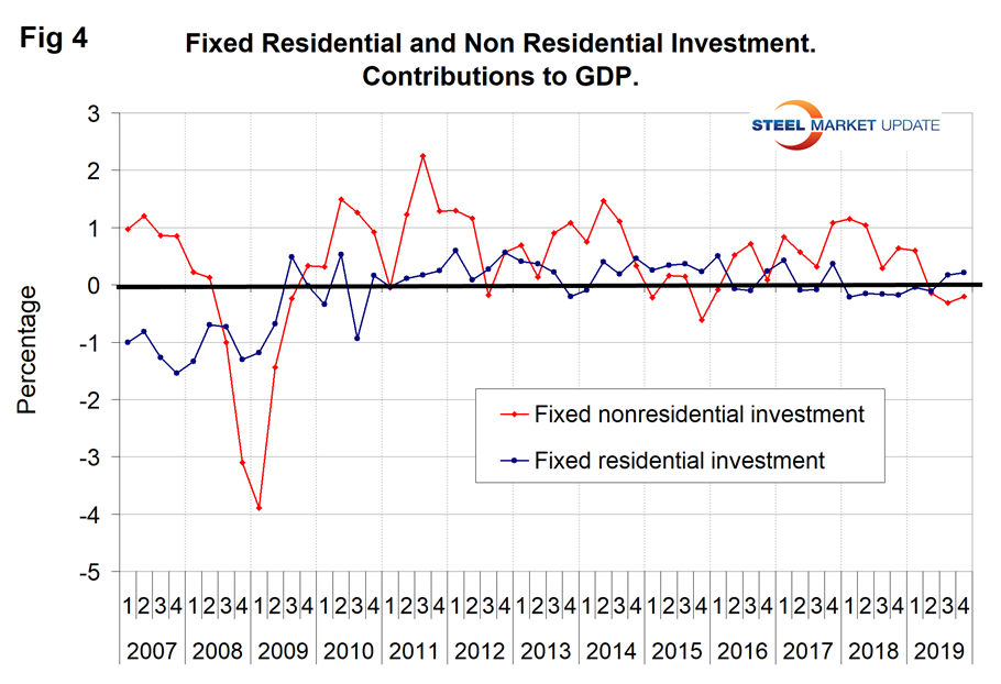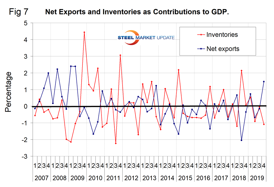 SMU Comment: On a trailing 12-month basis, GDP growth has declined from 3.2 percent in Q2 2018 to 2.32 percent in Q4 2019. We think is the best way to look at this data because the headline quarterly result can be highly volatile. The fourth-quarter result was unusual because the contribution of net exports was the highest since Q2 2009. Figure 7 isolates the contribution of net exports and inventories. There seems to be a strong tendency for these to bail each other out and to make the headline quarterly result more stable than it otherwise would be.