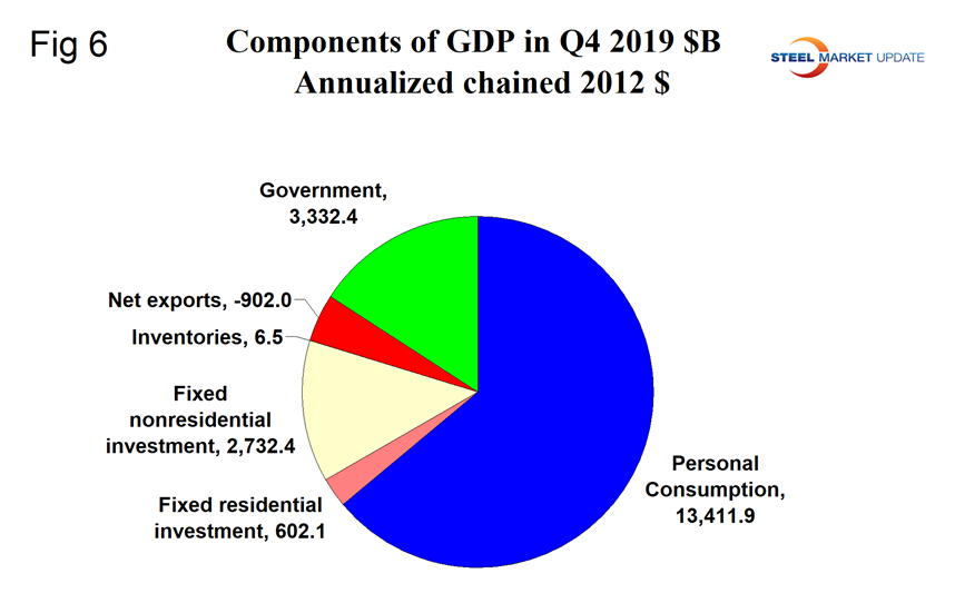 Figure 5 shows the quarterly contributors of the six major subcomponents of GDP since Q1 2007. This chart clearly shows the whipsaw effect of inventory changes, which are coded pale blue. It also shows the unusually high contribution of net exports in Q4 and the decline in personal consumption expenditures in Q4 compared to Q2 and Q3 of 2019. The contribution of personal consumption in Q4 was 1.20 percent. The average since Q1 2017 has been 1.9 percent.