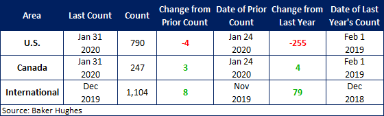 The number of active U.S. rigs fell by 4 to 790, with oil rigs down 1, gas rigs up 3, and miscellaneous rigs unchanged. Compared to this time last year, the 790 count is down 255 rigs, with oil rigs down 172, gas rigs down 86, and miscellaneous rigs up 3. See the first graph below for a history of active U.S. rig counts.